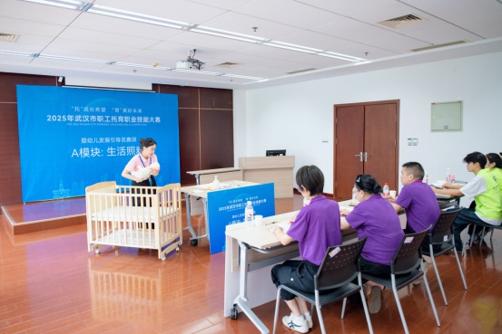 作为推进产业工人队伍建设改革在民生领域的具体实践,本次大赛紧扣托育行业核心需求,以“‘托’成长希望‘育’美好未来”为主题,设置婴幼儿发展引导员、保育师两大工种,采用3人制团队赛模式,通过“理论考试+实际操作”综合考评参赛队伍能力。其中,理论考试以闭卷机考形式检验选手的专业知识储备,实操环节则模拟真实托育场景,围绕生活照料、卫生保健、应急处置、早期发展引导等关键领域展开;理论与实操成绩按3:7权重计入团体总分,确保全面、客观衡量团队综合专业水平,真正选拔出“懂理论、会实操”的优秀托育人才。