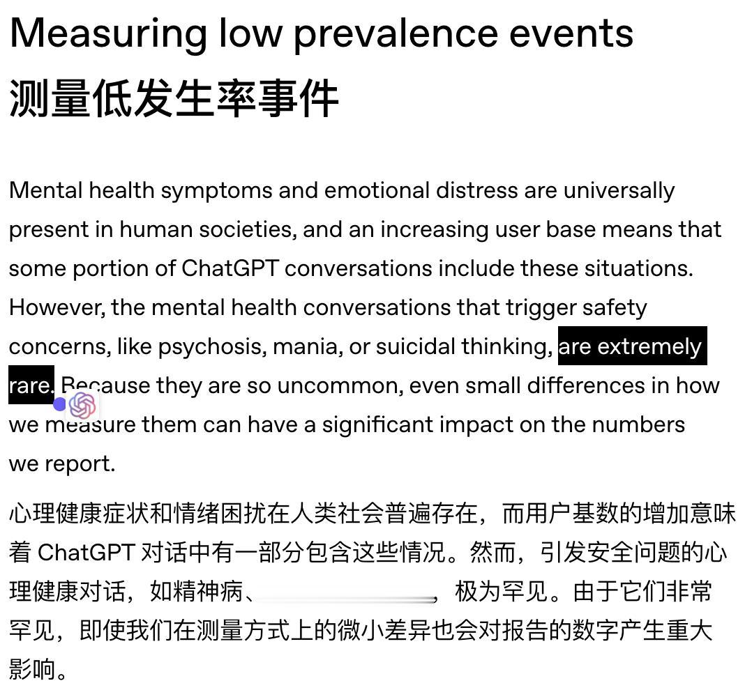 有人说,OpenAI 在自己的安全报告里面说,这些心理健康对话「极其罕见」,但实际是,即使 0.07% 听起来是一个很小的百分比,但在数亿的用户基数上,这实际上是相当多的人。