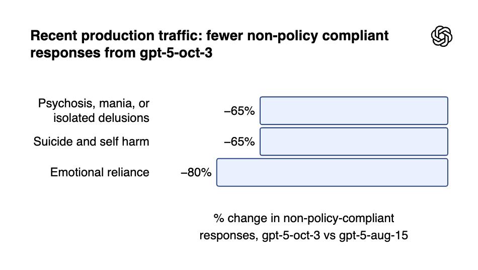 通过更好的模型回答,自动弹出专业热线信息、引导用户寻求现实帮助,甚至在长时间对话后,提醒用户稍作休息,等等这些更新。OpenAI 声称现在的 ChatGPT 提升效果明显。