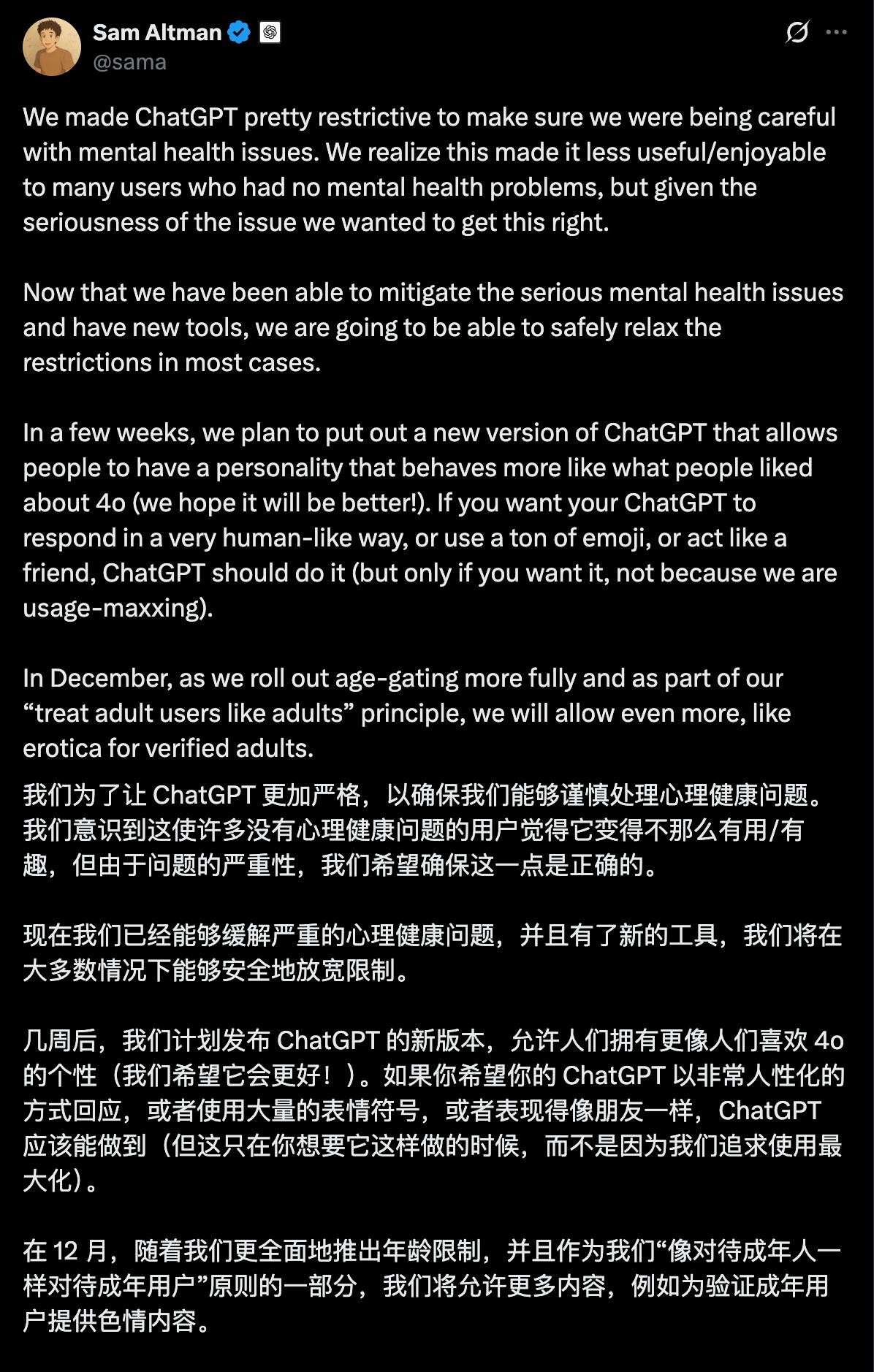 奥特曼在两周前,也已经预告了 ChatGPT 关于心理健康的更新,来平息这些关于 OpenAI 不负责、不安全的言论。