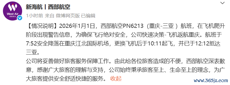 西部航空通报一客机紧急返航:飞机爬升阶段出现警告信息西部航空通报一客机紧急返航:飞机爬升阶段出现警告信息